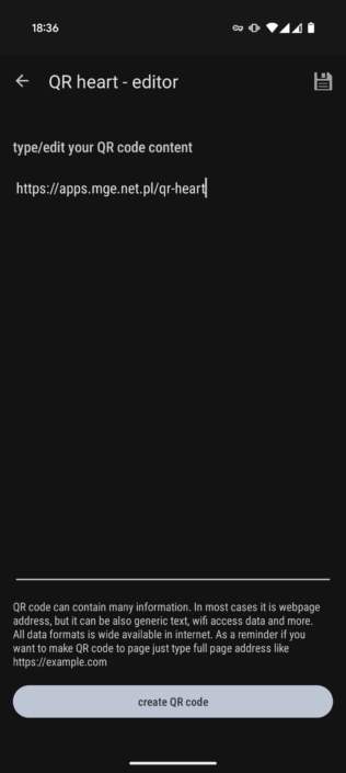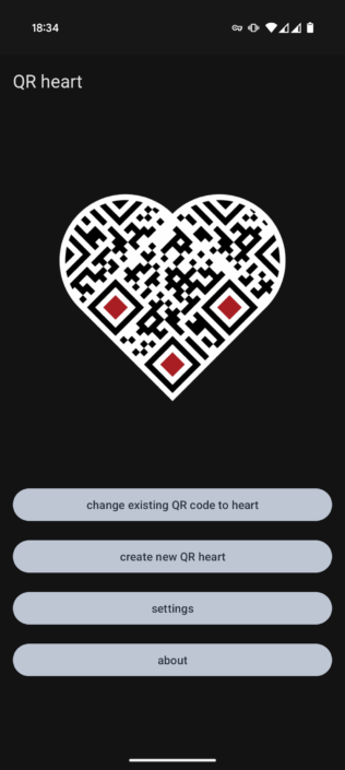 The app is very simple – so everything should be straight simple. But if you need some more hints: after you open app there are few buttons. If you have QR code and just want to make cute QR heart from it use first button, if you want to create new code just use second button. In most cases you will try to type some web page address in it. Just remember that you need to type whole address with https:// before whole www thing 😉