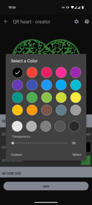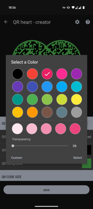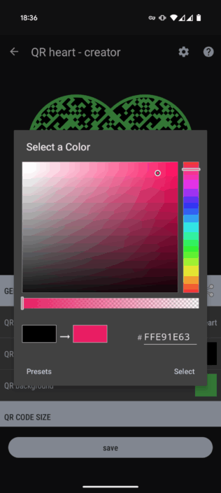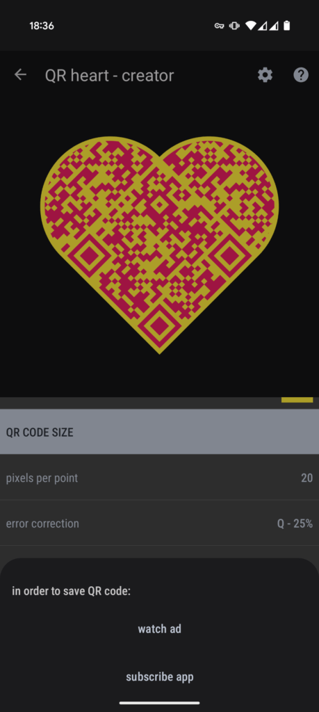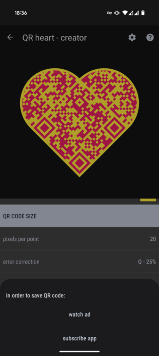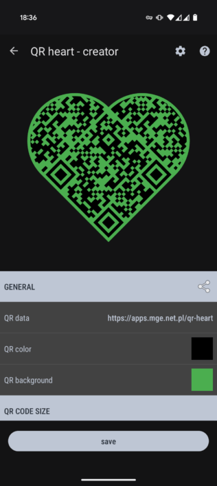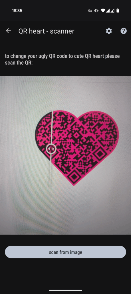 App is easy to use – just use build-in QR scanner to get original QR data and then customize heart as you want. If you don’t have QR code – not a problem just type whatever you want (for example web page address) and QR heart will create brand new QR code for you.